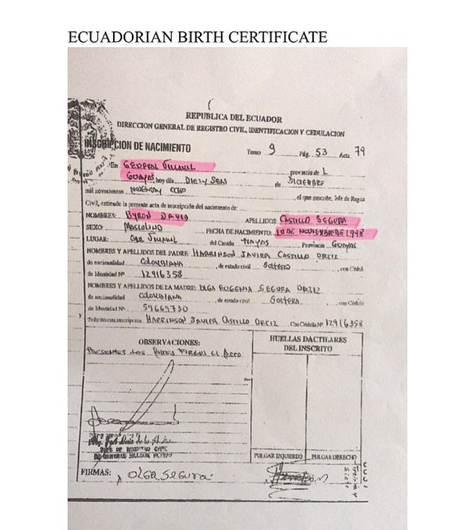 Theo nhật báo Daily Mail (Anh), chính Byron Castillo thừa nhận rằng anh đã sử dụng hộ chiếu giả khi tham dự các trận đấu của tuyển Ecuador, có giấy tờ và băng ghi âm chứng thực. Castillo thừa nhận anh sinh năm 1995 với tên đầy đủ Bayron Javier Castillo Segura chứ không phải nhân vật mang tên Byron David Castillo Segura sinh năm 1998, được ghi rõ trên giấy khai sinh và sau đó, trên hộ chiếu giả mang quốc tịch Ecuador.