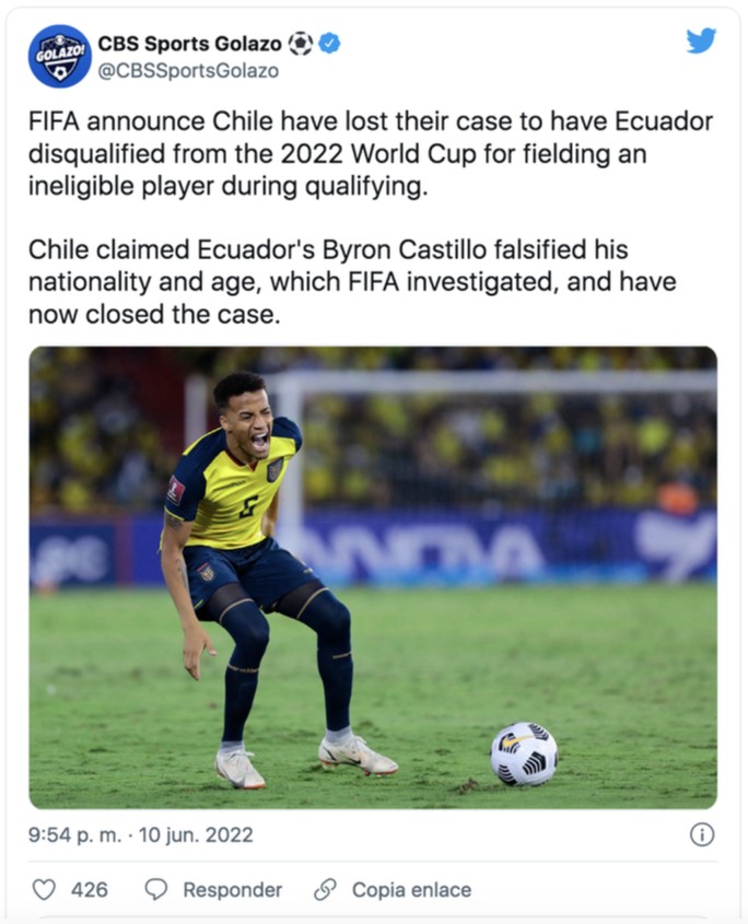 Theo thông tin từ nhật báo Marca (Tây Ban Nha), CAS đã ra phán quyết dập tắt mọi hy vọng của hai LĐBĐ Chile và Peru trong việc yêu cầu tước bỏ quyền dự World Cup 2022 của tuyển Ecuador. Phán quyết của CAS vẫn giữ tư cách tham dự World Cup 2022 của Ecuador nhưng khẳng định đội tuyển này sẽ bị trừ 3 điểm khi tham gia vòng loại World Cup 2026 vì sử dụng tài liệu giả để xin hộ chiếu cho 1 cầu thủ sinh ra ở Colombia.