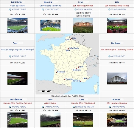 VCK EURO 2016 sẽ được tổ chức ở 10 SVĐ lớn nhất nước Pháp, trong đó trận chung kết diễn ra ở SVĐ quốc gia Stade de France.