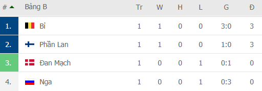 BXH Bảng B Euro 2020: