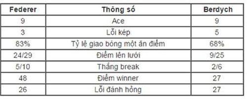 Set một, hai tay vợt thay nhau bẻ giao bóng đối thủ trong game ba và bốn. Berdych cứu set-point khi giao bóng ở tỷ số 4-5, điểm 30-40. Nhưng hạt giống số sáu không thể làm nhiều hơn trong loạt tie-break sau đó. Sang set hai, Federer bắt đầu tăng tốc và không cho Berdych thêm một cơ hội.