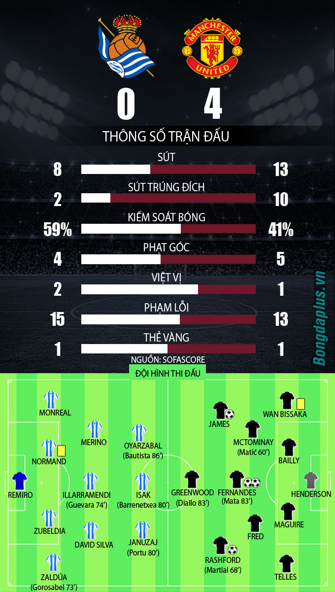 Kết quả trận đấu Sociedad vs MU là 4-0 nghiêng về phía đội khách. Man United chiếm lợi thế cực lớn trước trận lượt về và chỉ có một điều thần kỳ mới có thể giúp Sociedad lội ngược dòng trên sân của đối thủ.