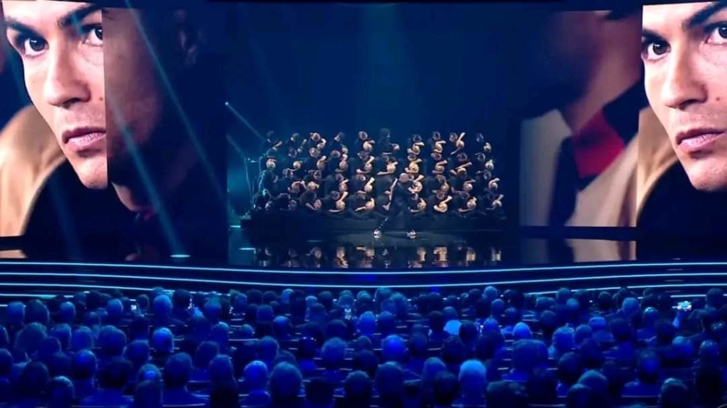 Hình ảnh Ronaldo được ban tổ chức trình chiếu trên màn hình lớn là khi anh dự bị trong trận Bồ Đào Nha thắng Thụy Sĩ 6-1 ở vòng 1/8 World Cup 2022. Trận này, tiền đạo 38 tuổi chỉ vào sân từ phút 74, khi Bồ Đào Nha đang thắng 5-1.