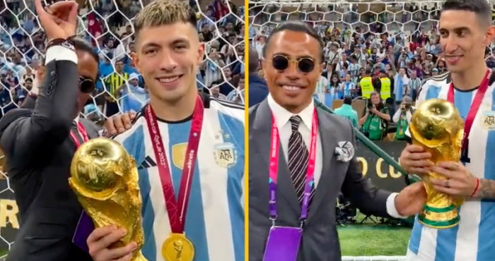 Chưa dừng lại ở đó, Salt Bae liên tục có những hành động quá lố. Doanh nhân- đầu bếp người Thổ Nhĩ Kỳ 2 lần nắm lấy cánh tay của Messi, dù đội trưởng tuyển Argentina cố gắng né tránh. “Thánh rắc muối” sau đó cũng chụp ảnh với Angel di Maria, Lisandro Martinez và thậm chí còn được nhìn thấy cắn vào huy chương vàng của 1 cầu thủ khác.
