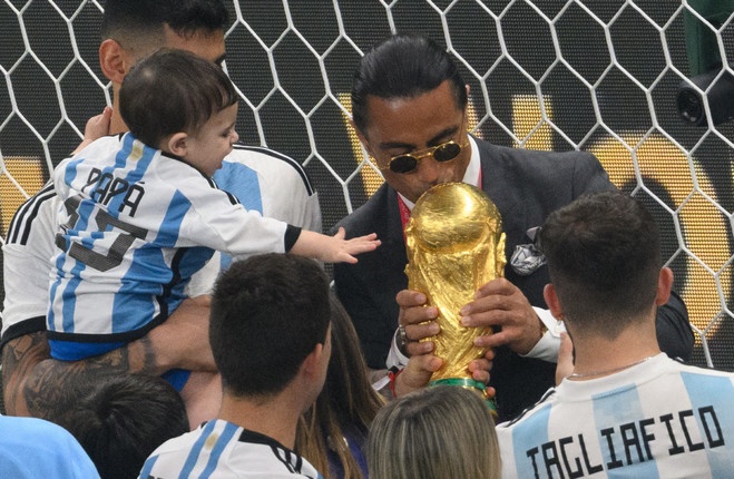 Sau trận chung kết World Cup 2022, "thánh rắc muối" Salt Bae bất ngờ xuất hiện dưới sân Lusail tham gia vào lễ ăn mừng của các cầu thủ Argentina. Theo AFP, sau khi vào sân, đầu bếp này nhiệt tình tạo dáng chụp ảnh với các cầu thủ Argentina khiến các nhà vô địch thế giới tỏ ra rất ngạc nhiên.