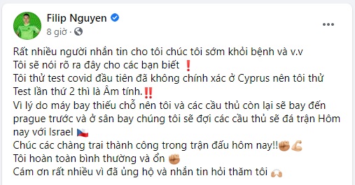 Trước thông tin này, Filip Nguyễn đã lên tiếng đính chính trên trang cá nhân: "Rất nhiều người nhắn tin chúc tôi sớm khỏi bệnh. Tôi có xét nghiệm COVID-19 lần 1 không chính xác. Kết quả xét nghiệm lần 2 có kết quả âm tính".