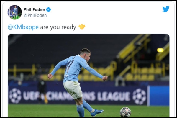 Sau khi lượt trận Tứ Kết champions League kết thúc và cặp đấu giữa Man City - PSG được xác định, tài khoản Twitter của tiền vệ Phil Foden xuất hiện bài đăng với nội dung ngắn gọn "Sẵn sàng chưa, Mbappe".