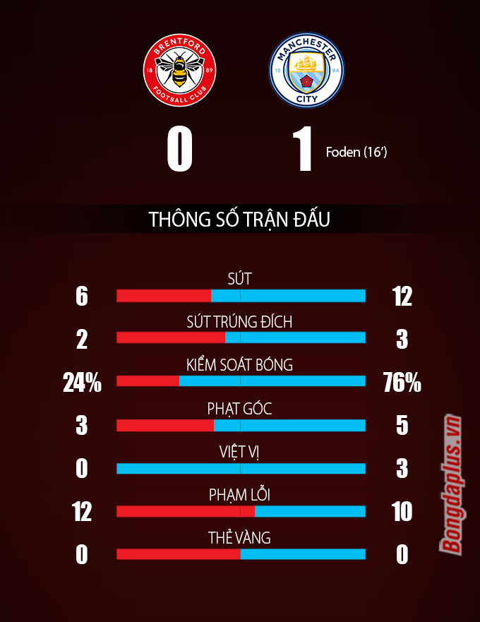 Nhưng đó là tất cả những gì Brentford có thể gây ra cho đối thủ. Khi Man City ổn định lại đội hình, họ nhanh chóng tạo ra cơ hội. Phút 16, từ đường chuyền một chạm thương hiệu của De Bruyne từ bên cánh phải, Foden dứt điểm một chạm tinh tế trong vòng cấm mở tỷ số.
