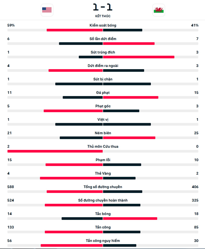 Trận đấu kết thúc với tỷ số hòa 1-1. Mỹ có thể cảm thấy tiếc nuối nhiều hơn khi đã đánh rơi chiến thắng ở những phút cuối. Còn với Xứ Wales, 1 điểm là đủ để họ hài lòng.