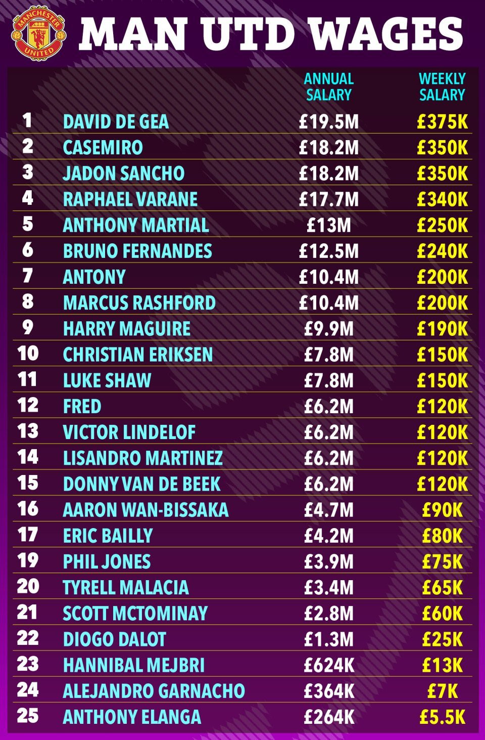 Nguồn tin độc quyền từ The Independent cho hay, Garnacho hiện đang là cầu thủ hưởng lương thấp thứ hai tại Old Trafford, chỉ 7.000 bảng mỗi tuần.