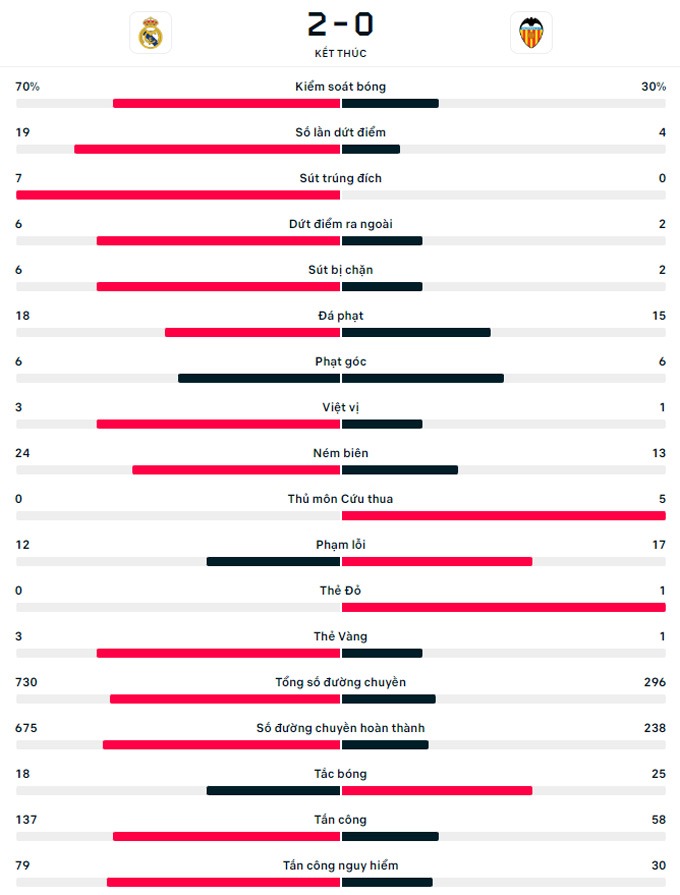 Chung cuộc, Real Madrid đánh bại Valencia 2-0 để tiếp tục bám đuôi Barca trên bảng xếp hạng La Liga 2022/23. Hiện tại, Kền Kền Trắng đang đứng thứ 2 với 45 điểm, kém Barca 5 điểm.