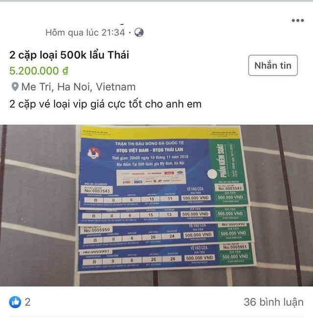Vé vào sân xem tuyển Việt Nam thi đấu do Liên đoàn Bóng đá Việt Nam quy định có 4 mệnh giá: 200.000 đồng, 300.000 đồng, 400.000 đồng và 500.000 đồng. Tuy nhiên, giá vé "chợ đen" đang bị dân phe đẩy lên mức cao. Trước cổng SVĐ Mỹ Đình thời điểm hiện tại, khi có người ngỏ ý muốn mua vé trận Việt Nam - Thái Lan ngày 19/11, phe vé lập tức ra giá cao hơn gấp nhiều lần, với lý do trận gặp Thái Lan được quan tâm nhiều hơn.