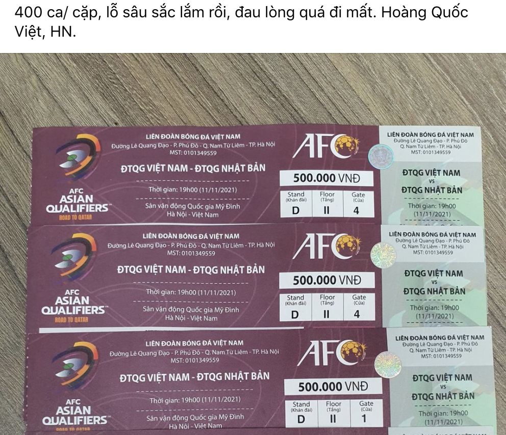 Ghi nhận ở thời điểm vài tiếng trước thời điểm diễn ra trận đấu (19h00), những người sở hữu vé vẫn đang đau đầu tìm cách đẩy đi để cắt lỗ. Trên các nhóm mua bán vé bóng đá Việt Nam, mức giá được đưa ra khiến nhiều người phải giật mình vì rẻ.