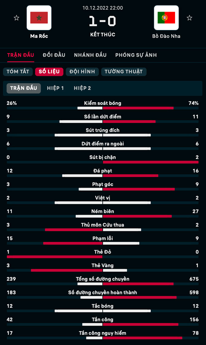 Tỷ số 1-0 được Morocco giữ tới hết trận. Như vậy, Morocco lại tạo ra thêm một cú sốc nữa ở World Cup khi loại cả Bồ Đào Nha. Họ đã trở thành đội tuyển châu Phi đầu tiên trong lịch sử lọt vào vòng bán kết một kỳ World Cup. Về phía Bồ Đào Nha, đây là thất bại tâm phục khẩu phục. Ronaldo đã có lời chia tay buồn với kỳ World Cup cuối cùng trong sự nghiệp mình.