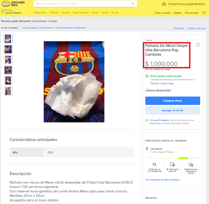 Sàn thương mại điện tử Mercado Libre (Argentina) vừa xuất hiện một "mặt hàng" có tên: "Khăn giấy của Messi trong lễ chia tay Barca để chuyển tới Paris Saint-Germain" và nó được bán với mức giá điên rồ lên tới 1 triệu USD.