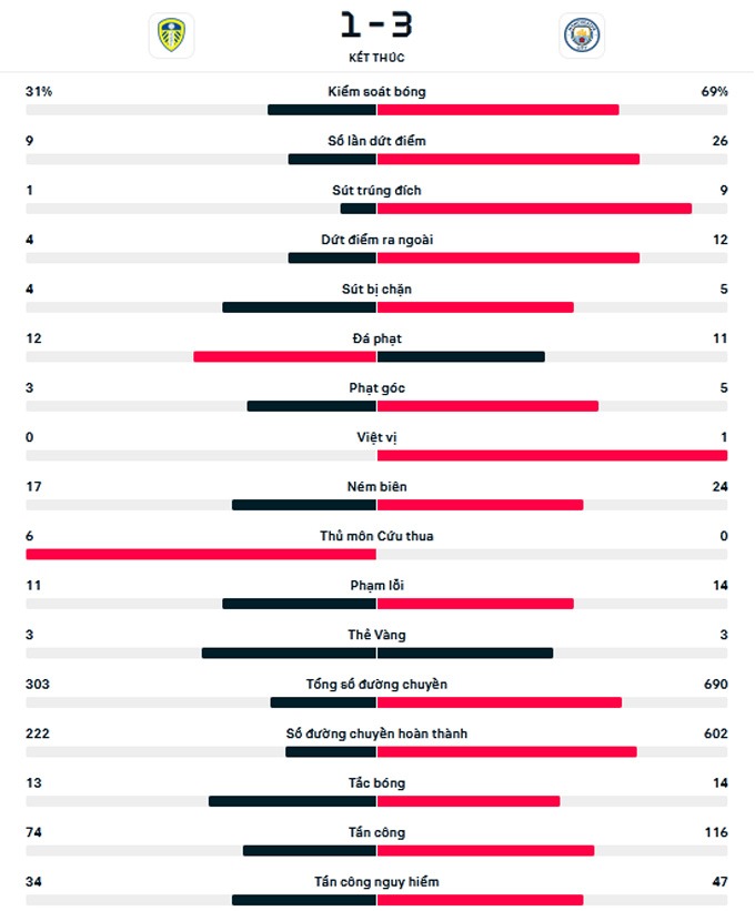 Những phút sau đó, thế trận hoàn toàn nằm trong quyền kiểm soát của Man xanh. Họ tấn công dồn dập và tạo ra hàng loạt cơ hội nguy hiểm. Nếu như không có may mắn và sự xuất sắc của thủ thành Meslier, Leeds đã phải nhận vài bàn thua.