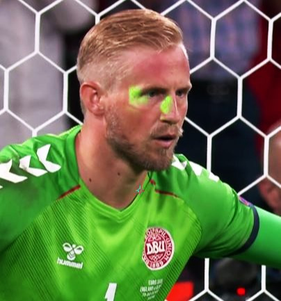 Ngay trước cú đá quyết định này, phần mắt phải của thủ thành Kasper Schmeichel bỗng hiện lên ánh sáng xanh. Đây thực chất là ánh đèn laser được sử dụng nhằm gây xao nhãng thủ môn của tuyển Đan Mạch.