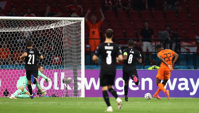 Những pha hãm thành liên tiếp của ĐT Hà Lan ngay từ những phút đầu tiên đã sớm được cụ thể hóa thành bàn thắng. Phút thứ 10, trung vệ đội trưởng David Alaba của Áo mắc sai lầm ngớ ngẩn khi dẫm vào chân của Denzel Dumfries trong vòng cấm. Trên chấm 11m, Memphis Depay không mắc sai lầm nào mở tỷ số trận đấu.