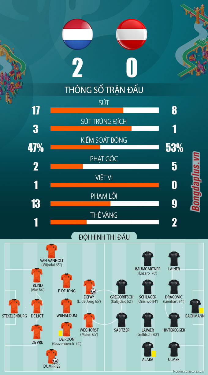 Hà Lan: Depay (11'-pen), Dumfries (67')