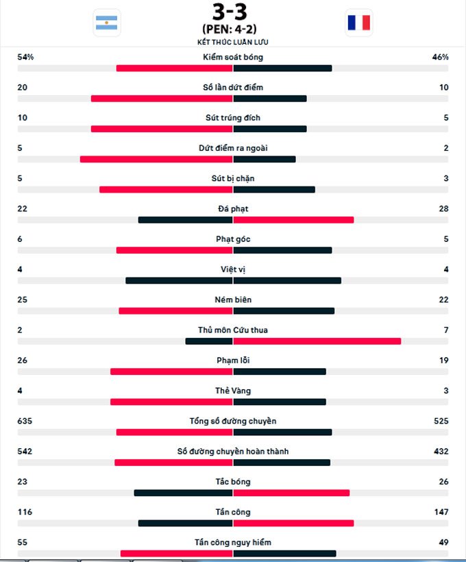 Thử thách quá lớn với Les Bleus và buộc HLV Didier Deschamps phải thực hiện cùng lúc 2 điều chỉnh. Ông rút Giroud và tội đồ Dembele ra, thay bằng những cầu thủ giàu sức mạnh hơn là Thuram và Kolo Muani vào sân để cải thiện khả năng tấn công cho Pháp. Cả hiệp 1, Les Bleus hoàn toàn bế tắc trong việc tìm đường vào khung thành Argentina. Họ không có bóng để chơi và các tuyến bị chia cắt. Còn Messi cùng đồng đội hoàn toàn áp đảo về các pha tấn công nguy hiểm, số cú sút và khả năng kiểm soát bóng khi hiệp 1 kết thúc.