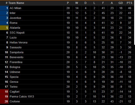 Thắng trận 2-0, thầy trò HLV Pirlo có được 39 điểm để vươn lên tạm chiếm vị trí thứ 3 trên bảng xếp hạng Serie A. Juventus hiện vẫn kém đội đầu bảng AC Milan 7 điểm nhưng thi đấu ít hơn đối thủ một trận.