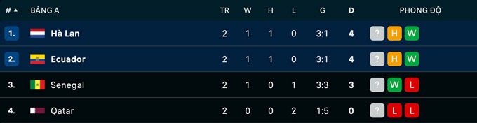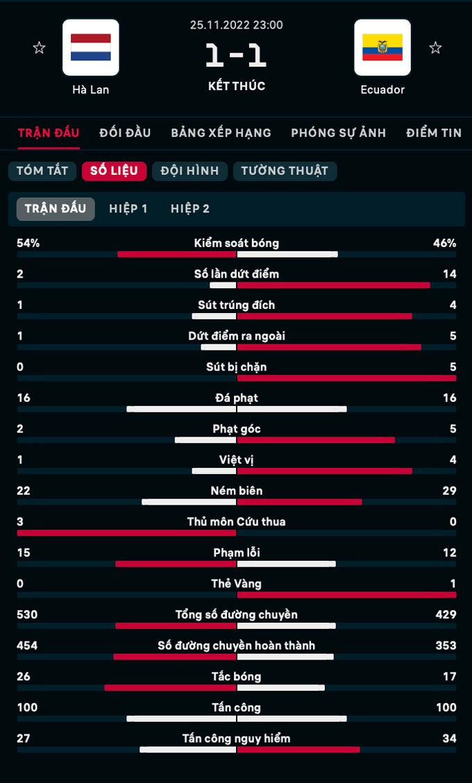 26/11/2022 09:00Hà Lan chia điểm nhọc nhằn trước Ecuador