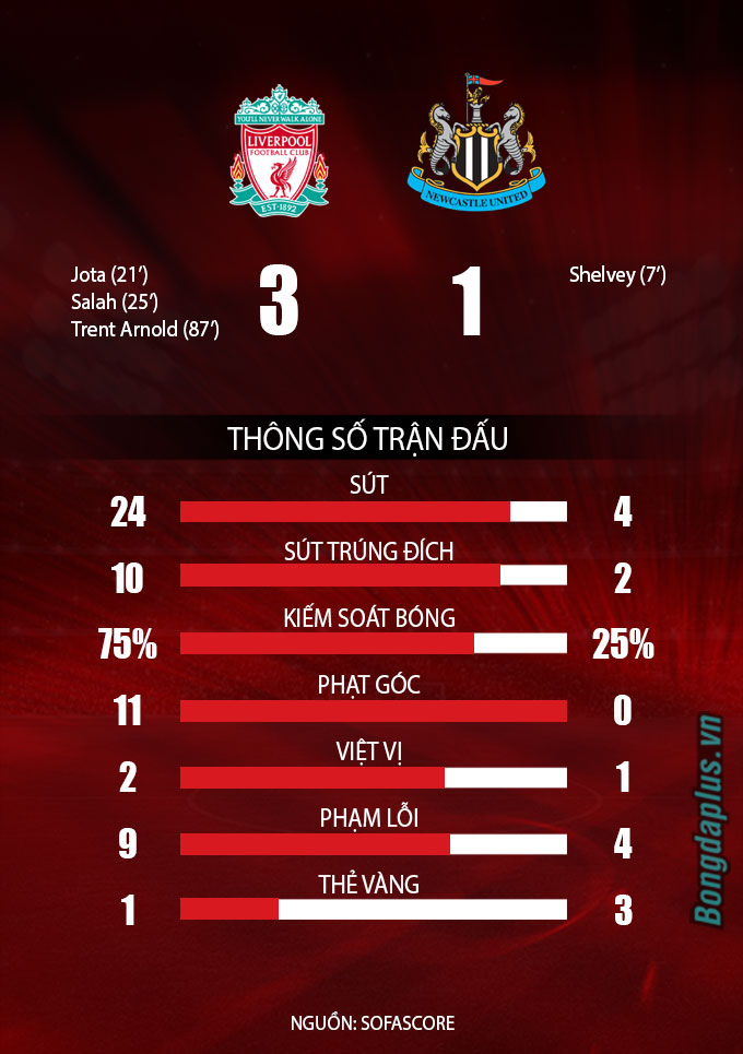 Trong trận đấu sớm của vòng 17, Man City đã vùi dập Leeds 7 bàn không gỡ. Với kết quả đó, họ tiếp tục dẫn đầu tại Premier League với 41 điểm, tạm bỏ xa Liverpool với khoảng cách 4 điểm. Thế nên, đội quân của HLV Juergen Klopp bước vào trận đấu rạng sáng nay với quyết tâm bằng mọi giá phải giành chiến thắng trước Newcastle. Nếu không, The Reds sẽ bị Man City “cắt đuôi” trong cuộc đua tới chức vô địch.