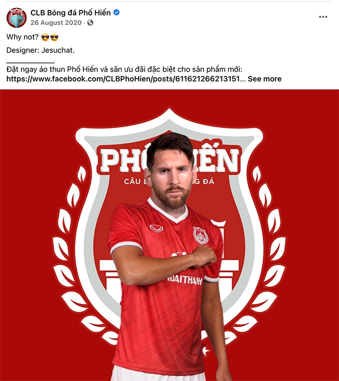 Ở giải Hạng Nhất, CLB Phố Hiến cũng khiến nhiều người "ngỡ ngàng, bật ngửa" về khả năng đưa Messi về Việt Nam với bức hình anh mặc chiếc áo của CLB cùng với dòng chú thích: “Why not? (Tại sao lại không nhỉ?).