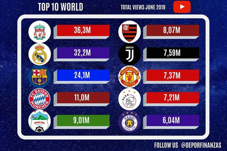 Mới đây, trang thống kê quốc tế Deporfinanzas đã bảng xếp hạng top 10 đội bóng được xem nhiều nhất trên Youtube tháng 6/2019. Trong đó có sự xuất hiện của 2 đội bóng Việt Nam là HAGL và Hà Nội FC.