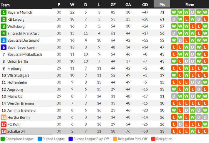 Sau 30 vòng đấu, "niềm tự hào của thành phố Gelsenkirchen" xếp bét bảng với vỏn vẹn 13 điểm, phá hàng loạt kỷ lục tệ hại của CLB lẫn giải đấu.