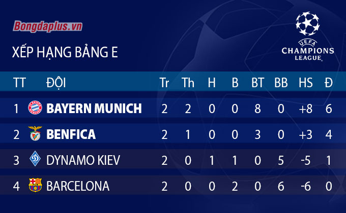 Như vậy sau 2 lượt trận, Bayern cho thấy sức mạnh tuyệt đối ở bảng G với 2 chiến thắng, ghi bàn 8 bàn, chưa lọt lưới bàn nào và có 6 điểm tuyệt đối. Các vị trí kế tiếp lần lượt thuộc về Benfica (4 điểm), Kiev (1) và Barca (0).