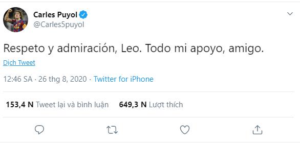 Cựu đội trưởng Barcelona, Carles Puyol, đã ngầm ám chỉ việc Messi ra đi sau khi có một dòng tweet ủng hộ người đồng đội cũ. Trên Twitter cá nhân, cựu trung vệ viết: "Luôn tôn trọng mọi quyết định của cậu, Leo. Tôi sẽ ủng hộ hết mình cho người anh em, cố lên".