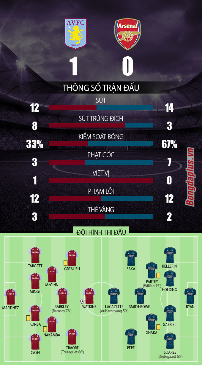 Chung cuộc, Arsenal bại 0-1 dưới tay Aston Villa trên sân Villa Park ở vòng 23 Ngoại hạng Anh. Đây là trận thua thứ 2 liên tiếp của họ, khiến đội bóng chôn chân ở vị trí thứ 10 với 31 điểm. Trong khi đó, Aston Villa đứng thứ 8 với 35 điểm.