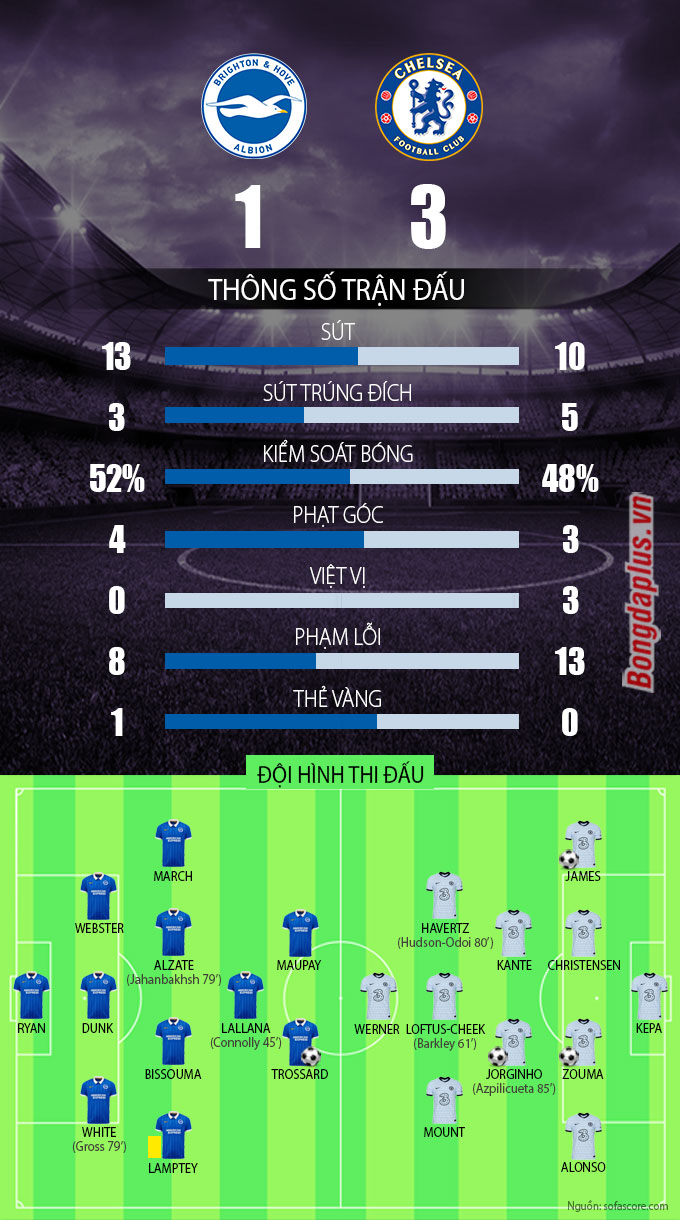 Trong khi đó, Brighton tỏ ra khá nguy hiểm trong những đường lên bóng. Hàng thủ của Chelsea đã phải cần tới sự trợ giúp của các cầu thủ ở tuyến trên mới có thể ngăn chặn thành công.