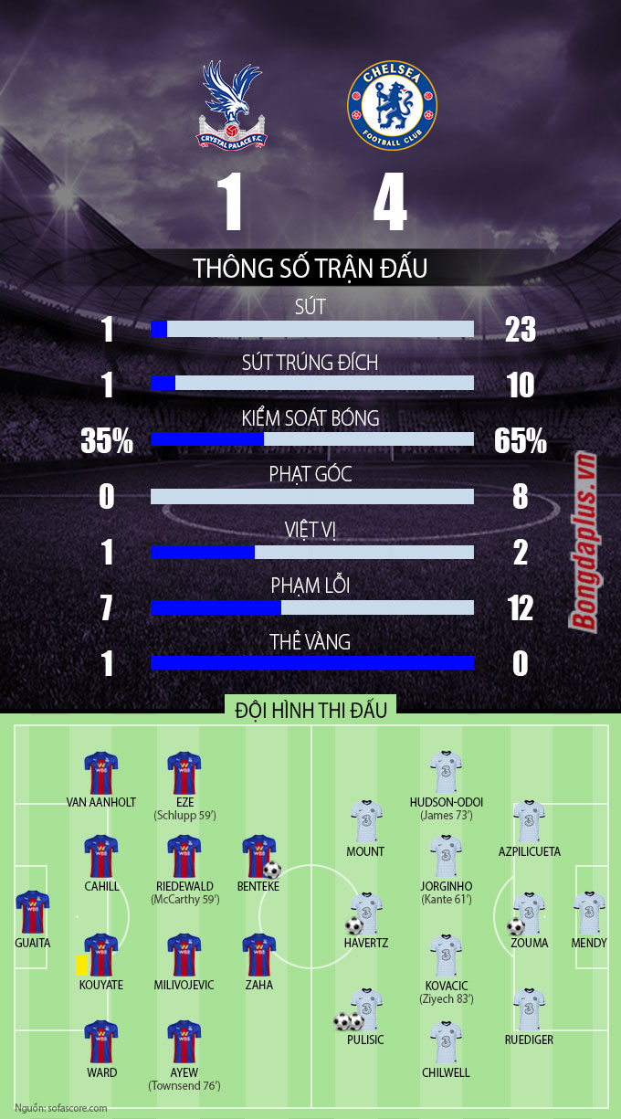 Với chủ nhà Crystal Palace, suốt 45 phút đầu tiên họ không có nổi một cú dứt điểm hướng về phía khung thành thủ môn Mendy. Tỷ số 0-3 phản ánh chính xác những gì đã diễn ra. Thậm chí, nếu như may mắn hơn, Havertz hay Rudiger phải có thêm ít nhất 1 bàn thắng trong những phút còn lại của hiệp 1.
