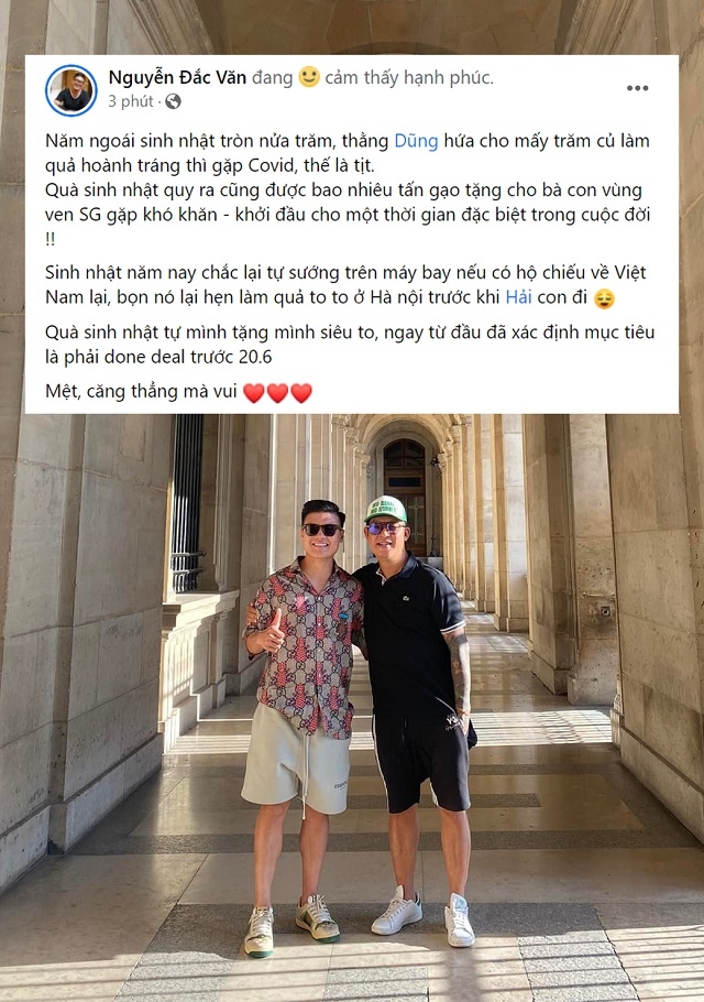 Trên trang cá nhân, người đại diện Quang Hải viết: "Quà sinh nhật năm nay tự mình tặng mình siêu to, ngay từ đầu đã xác định mục tiêu là phải cố gắng done deal (hoàn thành đàm phán) trước 20/6".