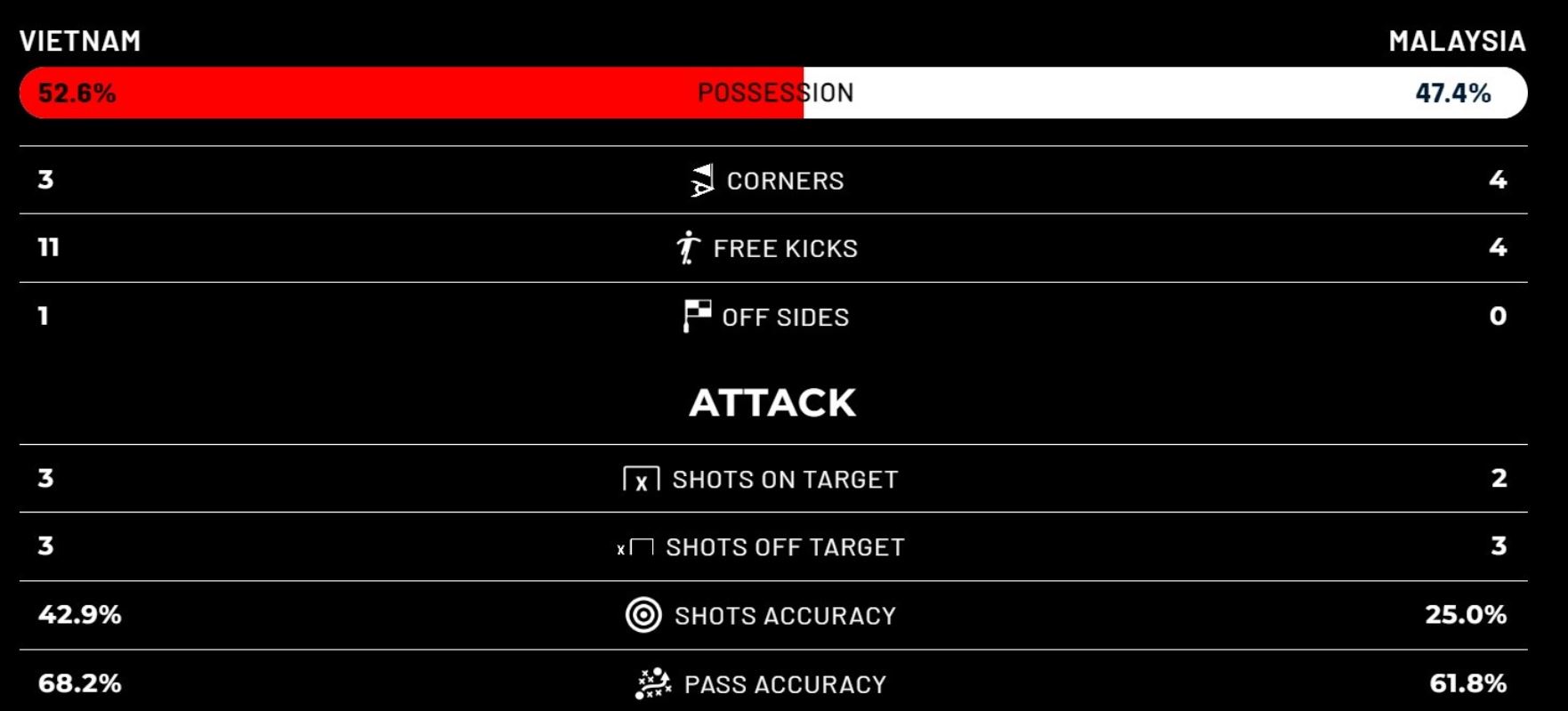 Số cơ hội của hai bên khá cân bằng. Điểm khác biệt của tuyển Việt Nam đến từ cú đánh đầu của Tiến Linh và những pha phản xạ xuất sắc của Văn Lâm.