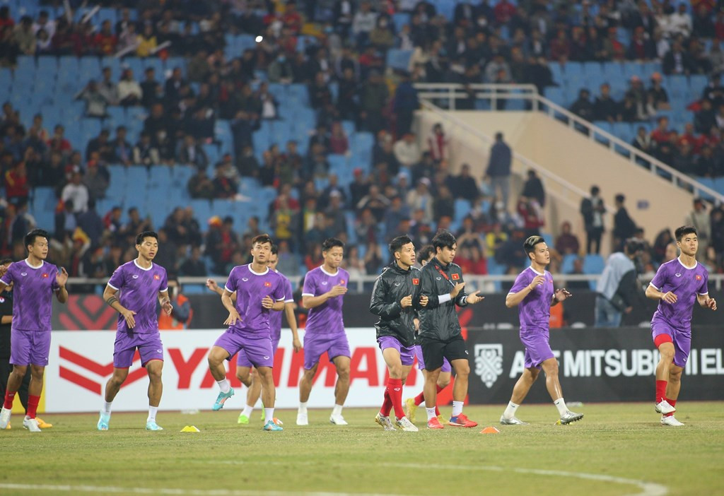 19h18': Các tuyển thủ Việt Nam khởi động trước trận đấu. Ảnh: Song Ngư