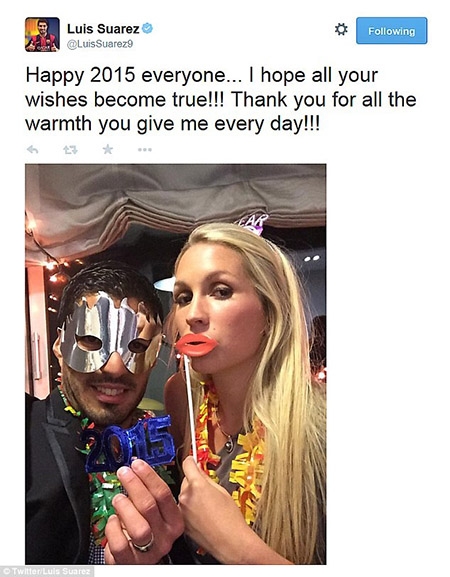 | Luis Suarez và vợ Sofia dự tiệc năm mới đồng thời gửi lời chúc tốt đẹp nhất tới tất cả mọi người. |