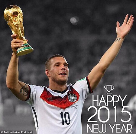 | Tiền đạo Lucas Podolski đăng bức ảnh giơ cao Cúp vàng World Cup lên Twitter để chào đón năm mới 2015. |