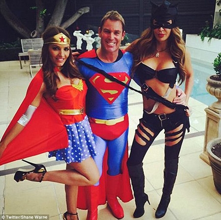 | Vận động viên cricket huyền thoại người Australia mặc trang phục siêu nhân chụp ảnh cùng với hai cô gái khi đón năm mới. |