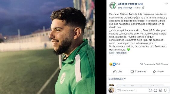 Nan nhân là Francisco Garcia, HLV của đội trẻ Atletico Portada Alta. Đáng chú ý, Garcia mới 21 tuổi, là người trẻ nhất ở Tây Ban Nha qua đời vì Covid-19. Anh cũng là HLV đầu tiên trên thế giới về ra đi về đại dịch này.