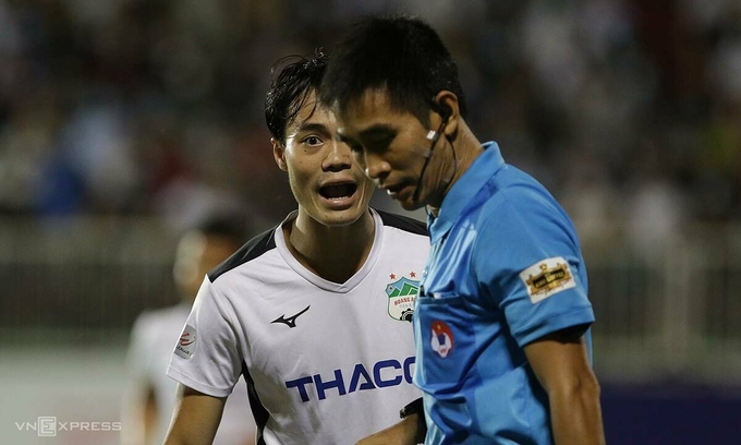 Văn Toàn phản ứng với quyết định của trọng tài Hoàng Thanh Bình. Ảnh: Anh Khoa