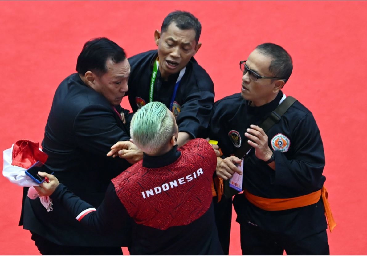 Trận chung kết hạng cân nam 50-55kg môn pencak silat giữa Khoirudin Mustakim (Indonesia) và Muhammad Khairi Adib Azhar (Malaysia) diễn ra rất căng thẳng. Thậm chí, một thành viên trong BHL tuyển Indonesia cũng không giữ được bình tĩnh và xô xát với trọng tài.