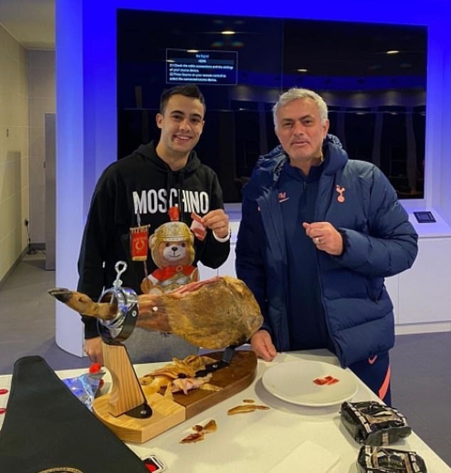 Và mới đây thì HLV Jose Mourinho đã đăng tải lên trang Instagram cá nhân hình ảnh chụp chung với hậu vệ Sergio Reguilon, trước mặt 2 người là một tảng thịt lớn được cho là loại đùi lợn muối trứ danh của vùng Iberico (Tây Ban Nha).