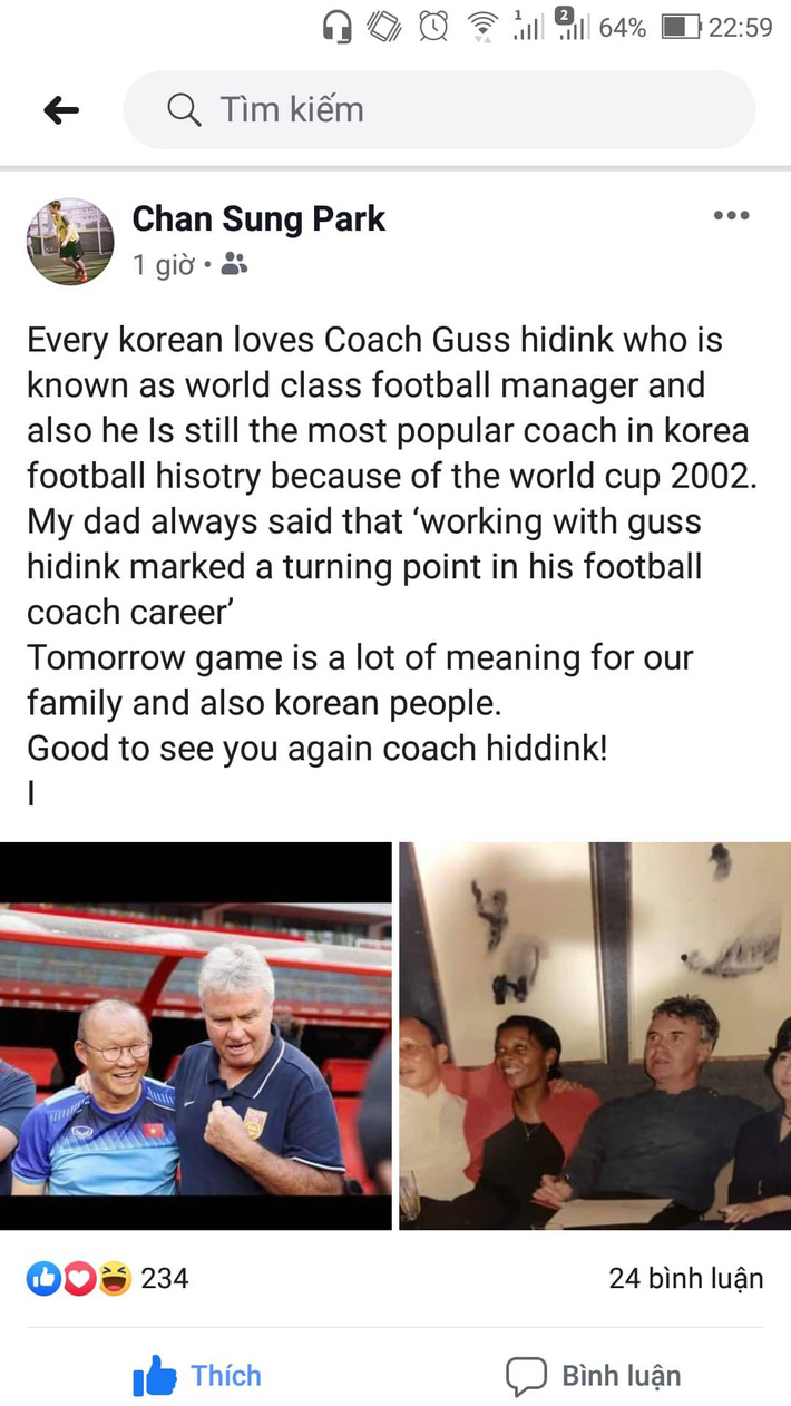 Chứng kiến cha khóc khi gặp lại HLV Guus Hiddink, con trai thầy Park cảm thán trên mạng xã hội: "Mọi người dân Hàn Quốc đều yêu mến HLV Guus Hiddink như một chiến lược gia đẳng cấp thế giới. Đến giờ ông vẫn rất nổi ở Hàn Quốc vì chiến tích ở VCK World Cup 2022.