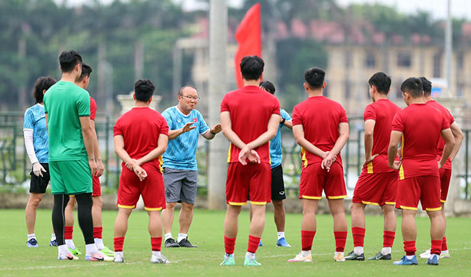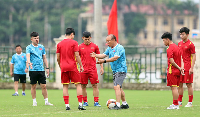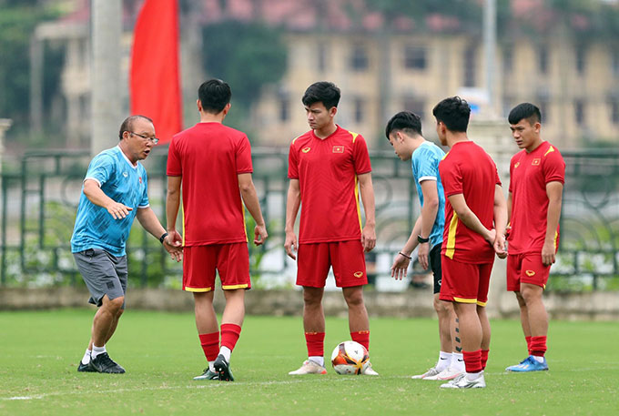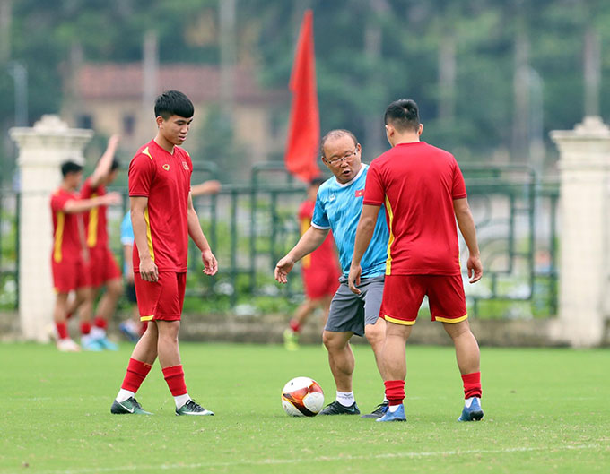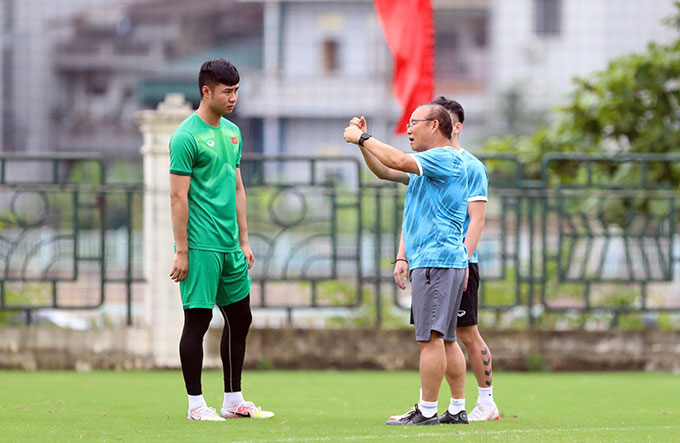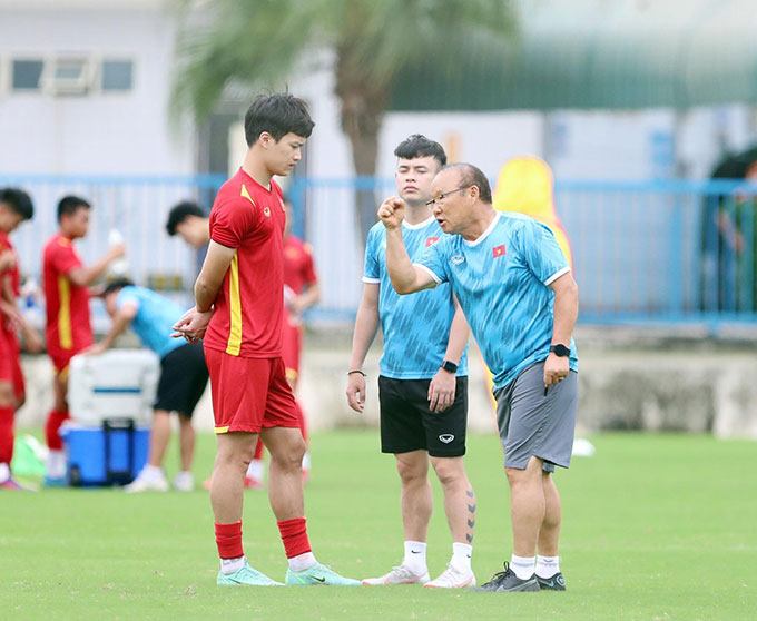 HLV Park Hang Seo gọi riêng các trụ cột ra để nhắc nhở, rút kinh nghiệm trong buổi tập chuẩn bị hướng tới lượt trận cuối bảng A SEA Games 31 gặp U23 Timor Leste.