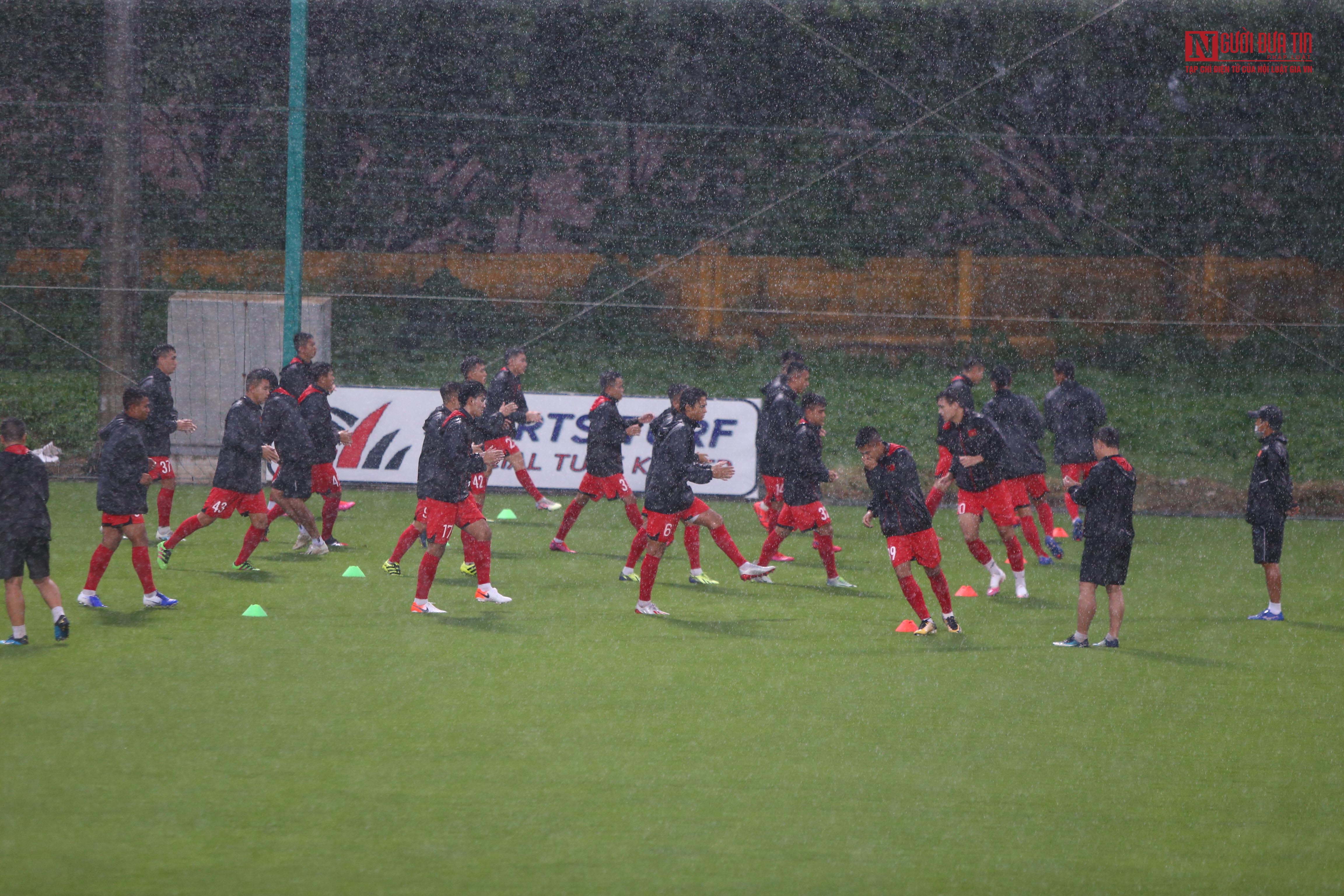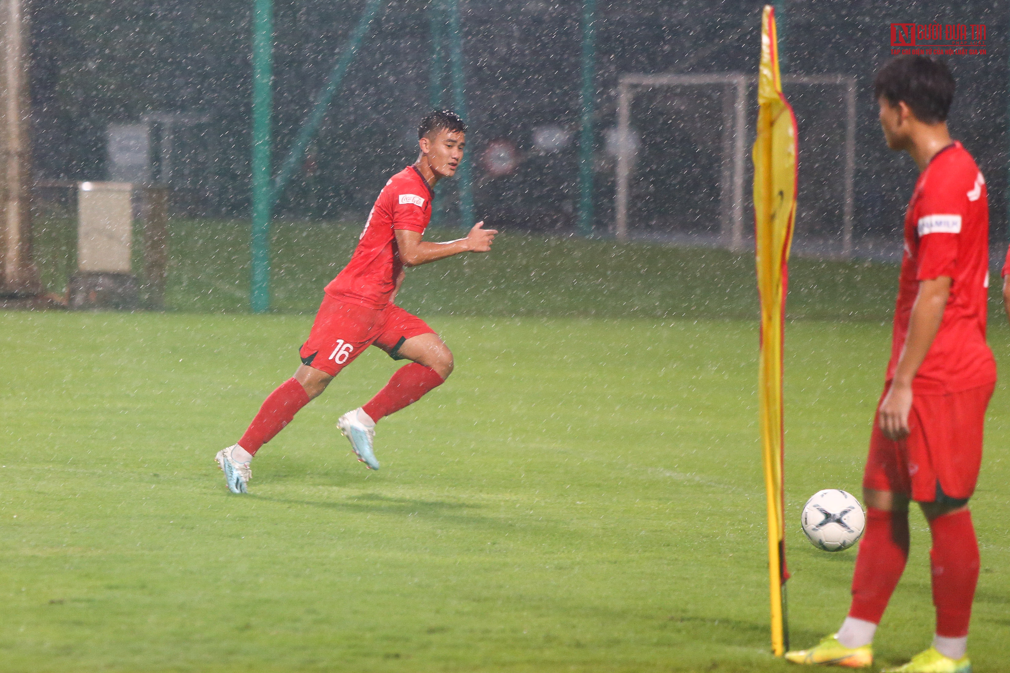 Mặc dù trời mưa lớn nhưng các cầu thủ U22 Việt Nam vẫn tập luyện hăng say và nghiêm túc.