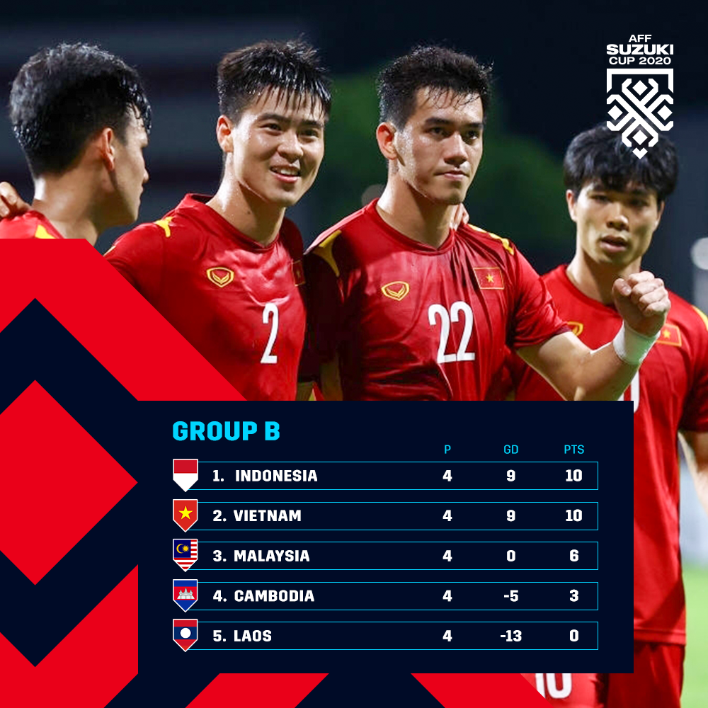 Với diễn biến như vậy, Việt Nam và Indonesia có cùng 10 điểm cùng hiệu số +9. Tuy nhiên, Indonesia xếp trên nhờ ghi nhiều bàn thắng hơn Việt Nam (13 so với 9). Theo đó, ĐT Việt Nam đứng nhì bảng B sẽ gặp Thái Lan - đội đứng nhất bảng A ở bán kết AFF Cup 2020. Trong khi đó, Indonesia sẽ đụng chủ nhà Singapore ở trận bán kết còn lại.