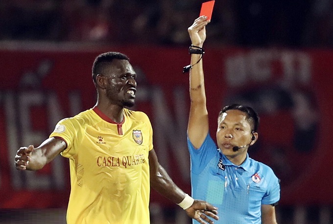 Thế nhưng đến phút 36, bước ngoặt của trận đấu đã diễn ra theo hướng bất lợi cho đội khách, khi Kelly Kester nhận thẻ vàng thứ 2 phải rời sân. Cầu thủ của Hồng Lĩnh Hà Tĩnh khiếu nại trọng tài Nguyễn Ngọc Châu sau khi cho rằng đã bị kéo ngã trong khu vực cấm địa đối thủ, nhưng không những không được hưởng phạt đền mà còn phải nhận thẻ.